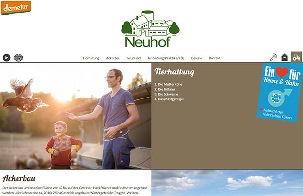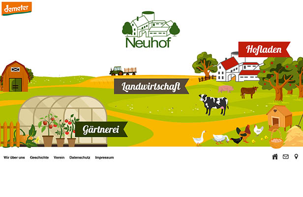 The Goyert family farm and horticultural business is run according to Demeter guidelines. A large, lovingly designed graphic on the homepage allows visitors to choose between the different sections “Farm Shop”, “Agriculture” and “Gardening”. These are also designed in different colors.