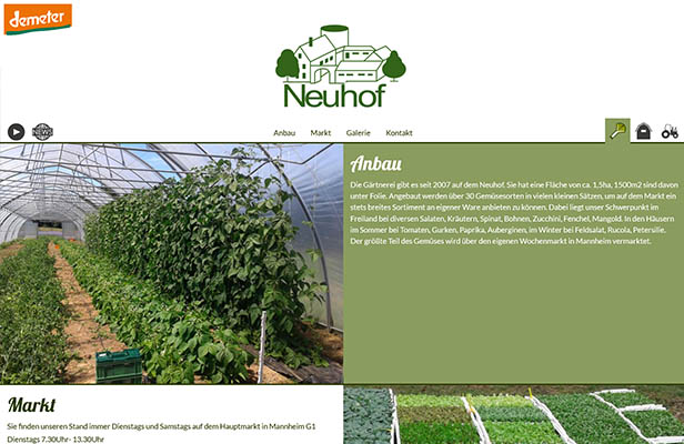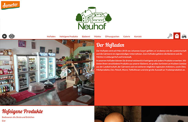 The Goyert family farm and horticultural business is run according to Demeter guidelines. A large, lovingly designed graphic on the homepage allows visitors to choose between the different sections “Farm Shop”, “Agriculture” and “Gardening”. These are also designed in different colors.